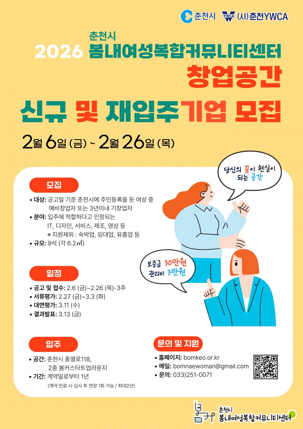 2026 봄내여성복합커뮤니티센터 창업공간 신규,재입주기업 모집(~02.26) 페이지 정보 작성자 춘천시1인창조기업지원센터 작성일26-02-23 18:01 조회25회 댓글0건 관련링크 다음글 목록 본문 2026 봄내여성복합커뮤니티센터 창업공간 신규,재입주기업 모집(~02.26) 다음글 목록