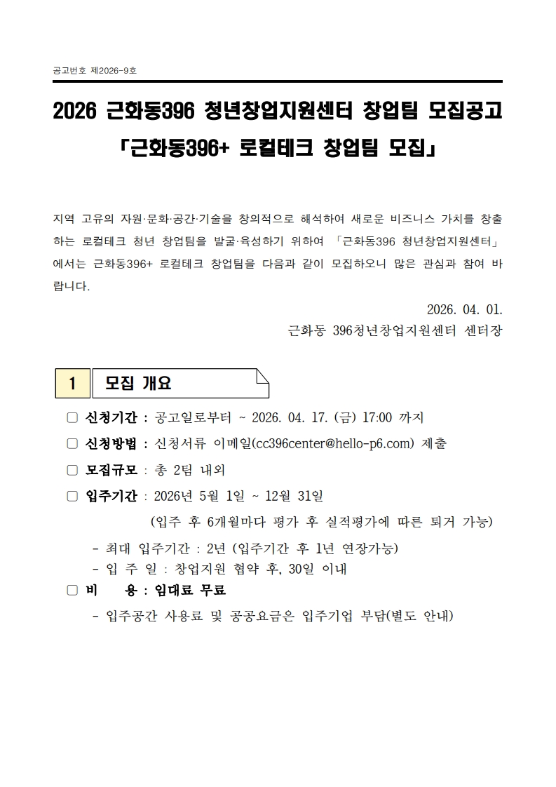 2026년 근화동396 청년창업지원센터 입주 창업팀 모집 공고(~04.17.) 페이지 정보 작성자 춘천시1인창조기업지원센터 작성일26-04-02 08:34 조회39회 댓글0건 관련링크 이전글 다음글 목록 본문 . 이전글 다음글 목록
